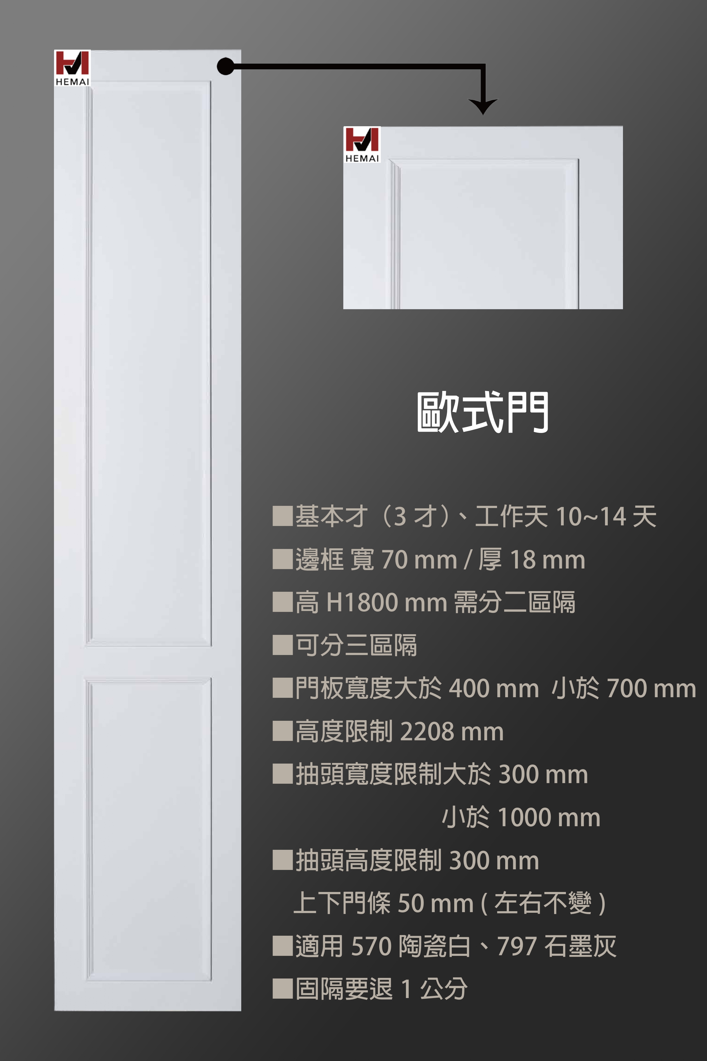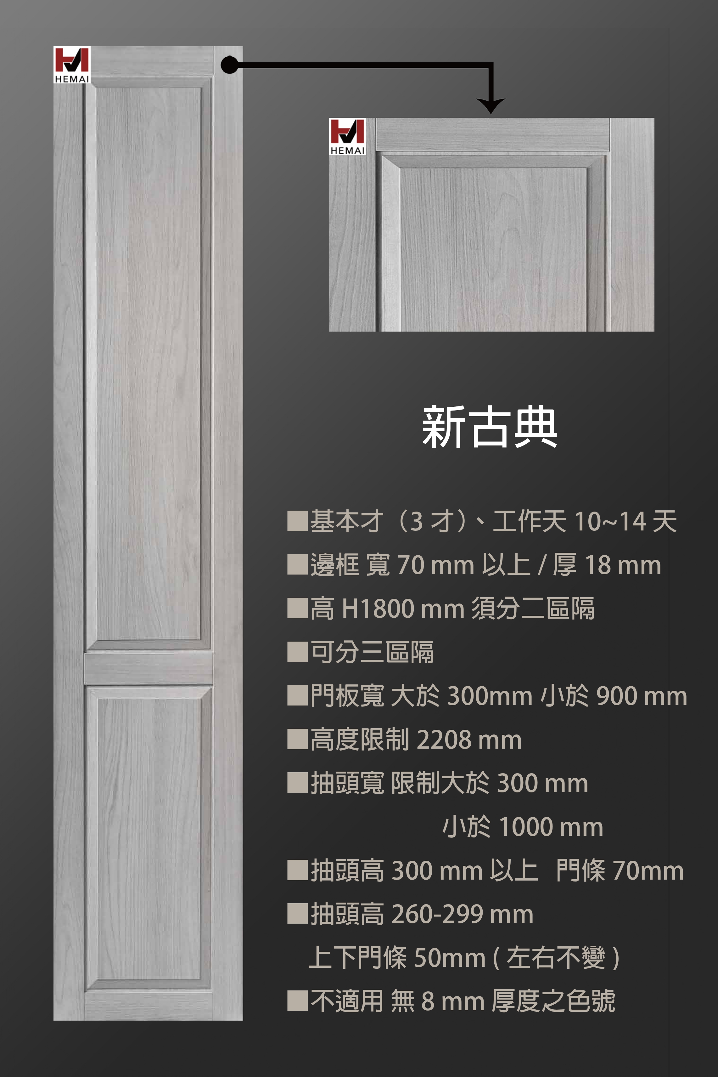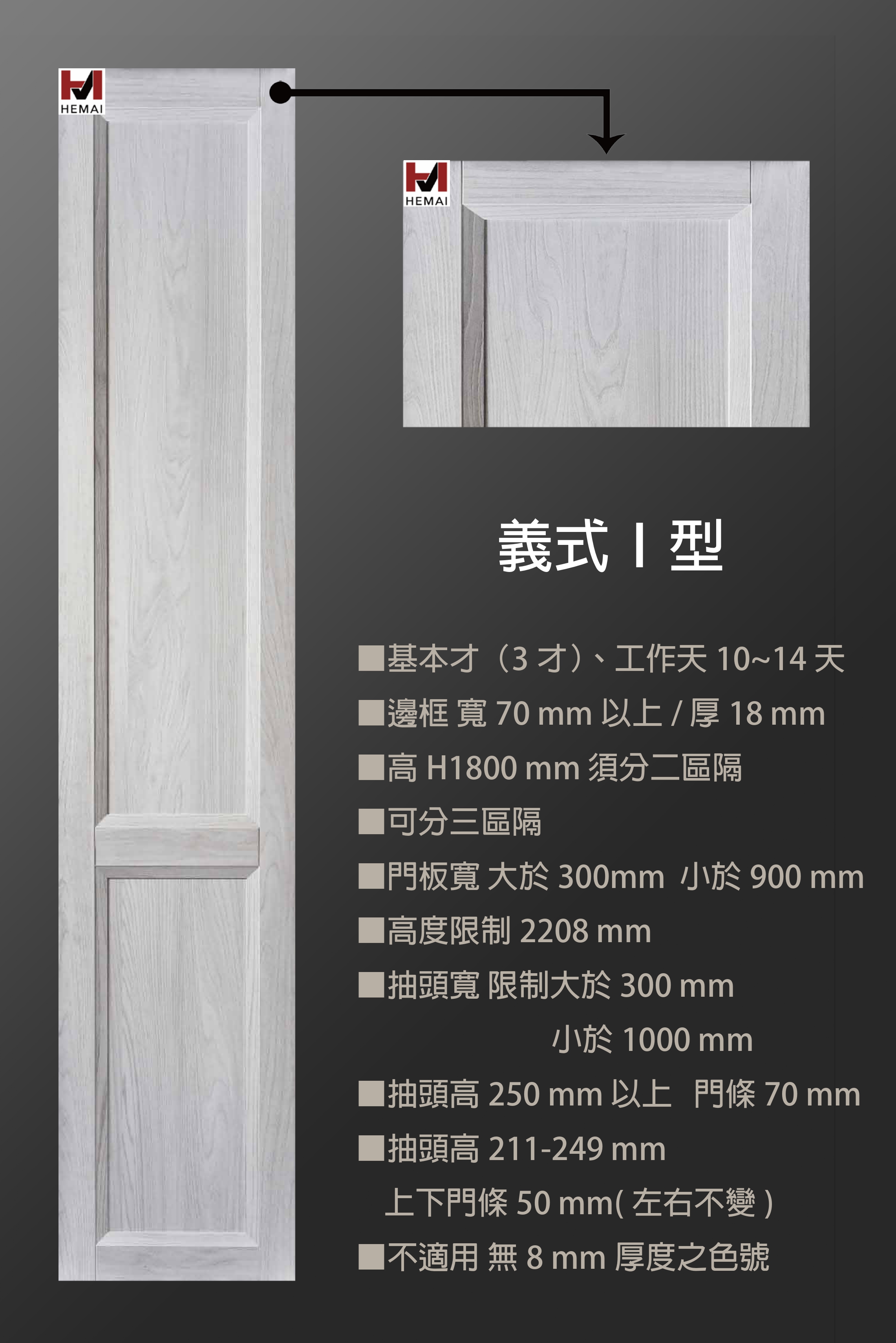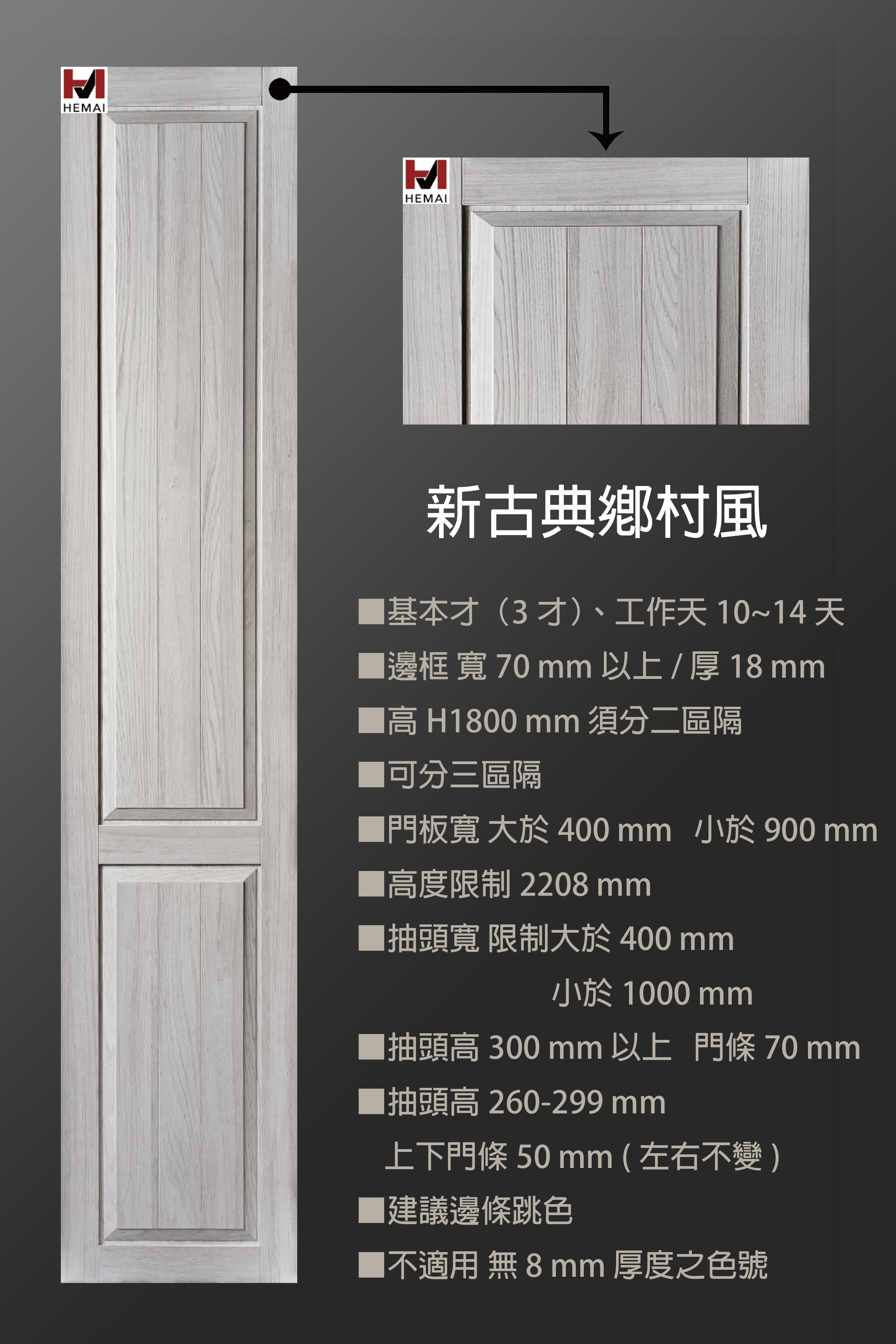 禾邁在造型樣式方面不斷力求創新,運用材料的特性不斷研發新的造型產品,在外型的變化與顏色搭配的巧思,創造千變萬化的全新樣式,造型門板皆以同色系統板加工製成,不僅無色差問題,並且在尺寸與外型的變化有相當大的彈性,在結構與耐久方面更經得起考驗。