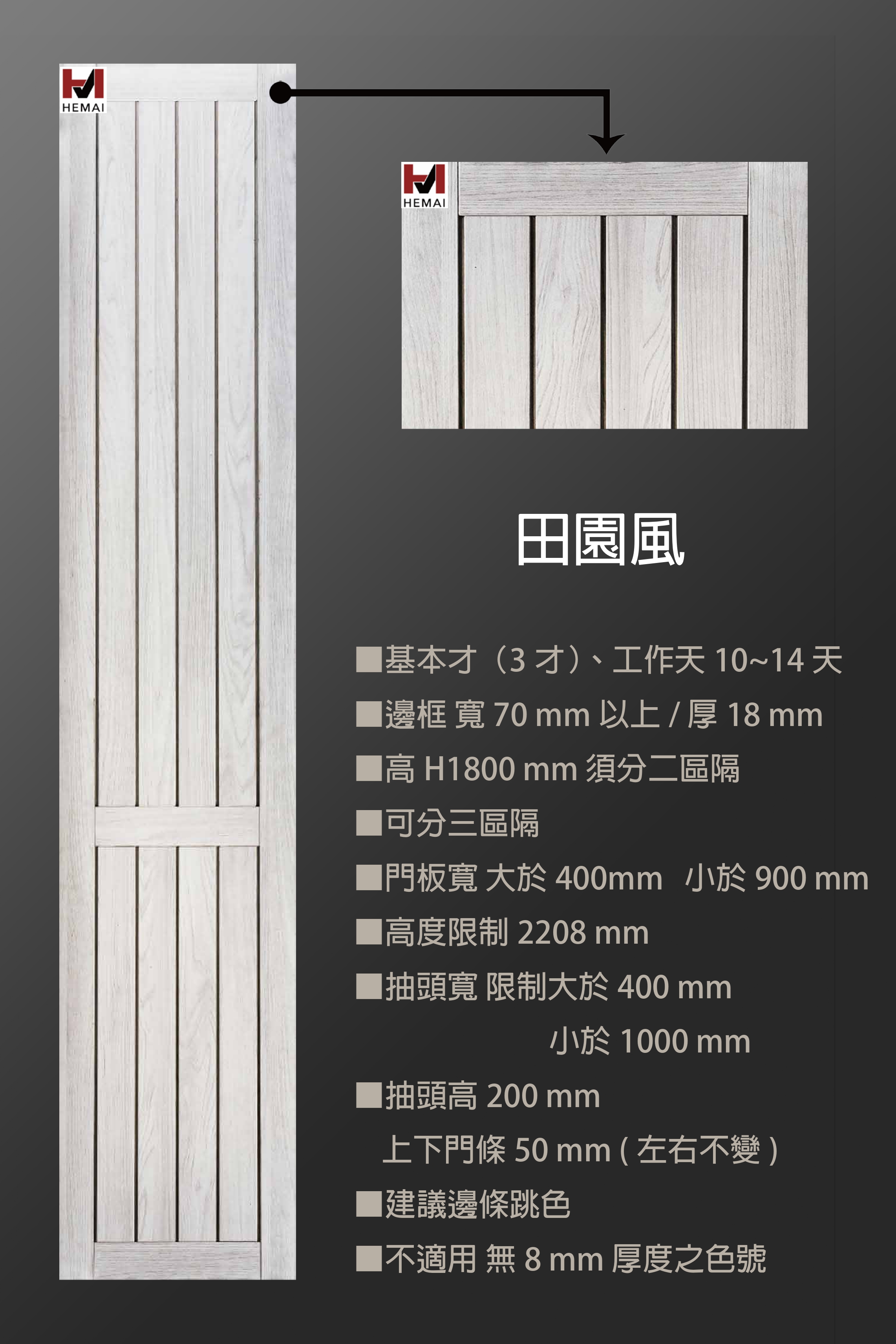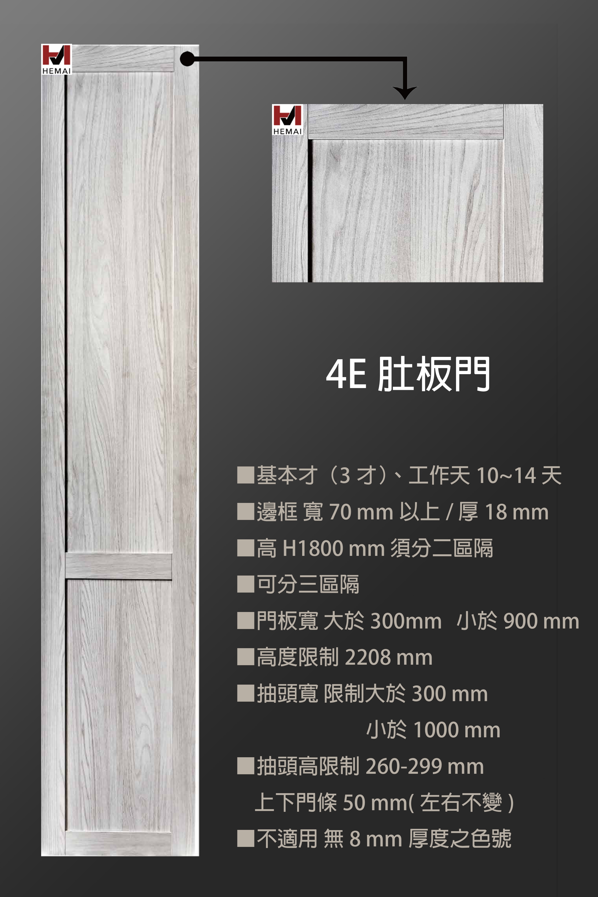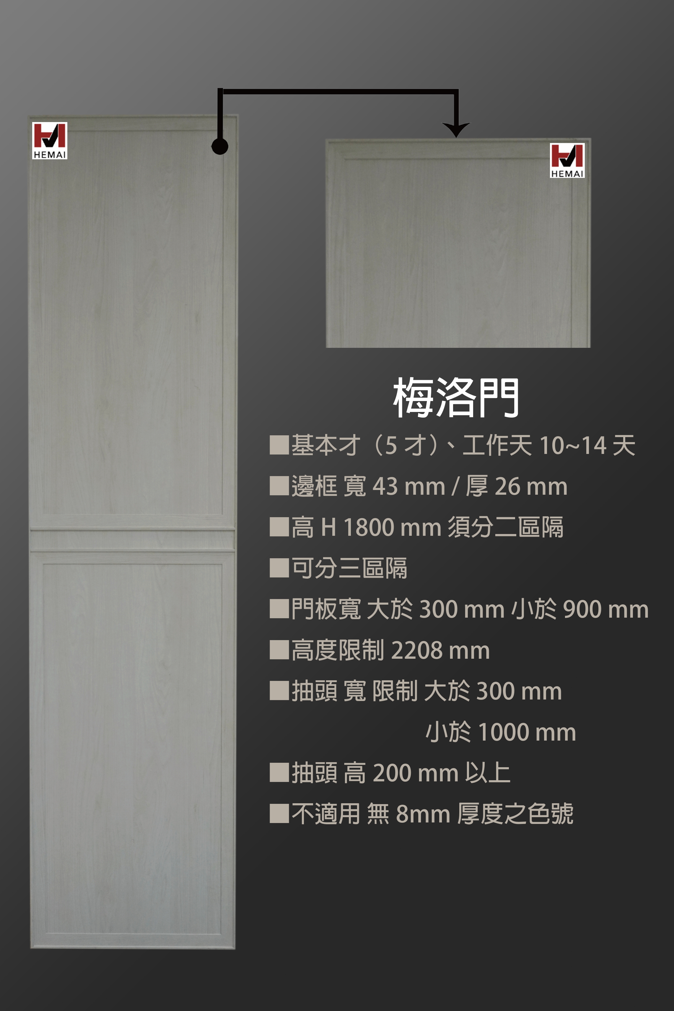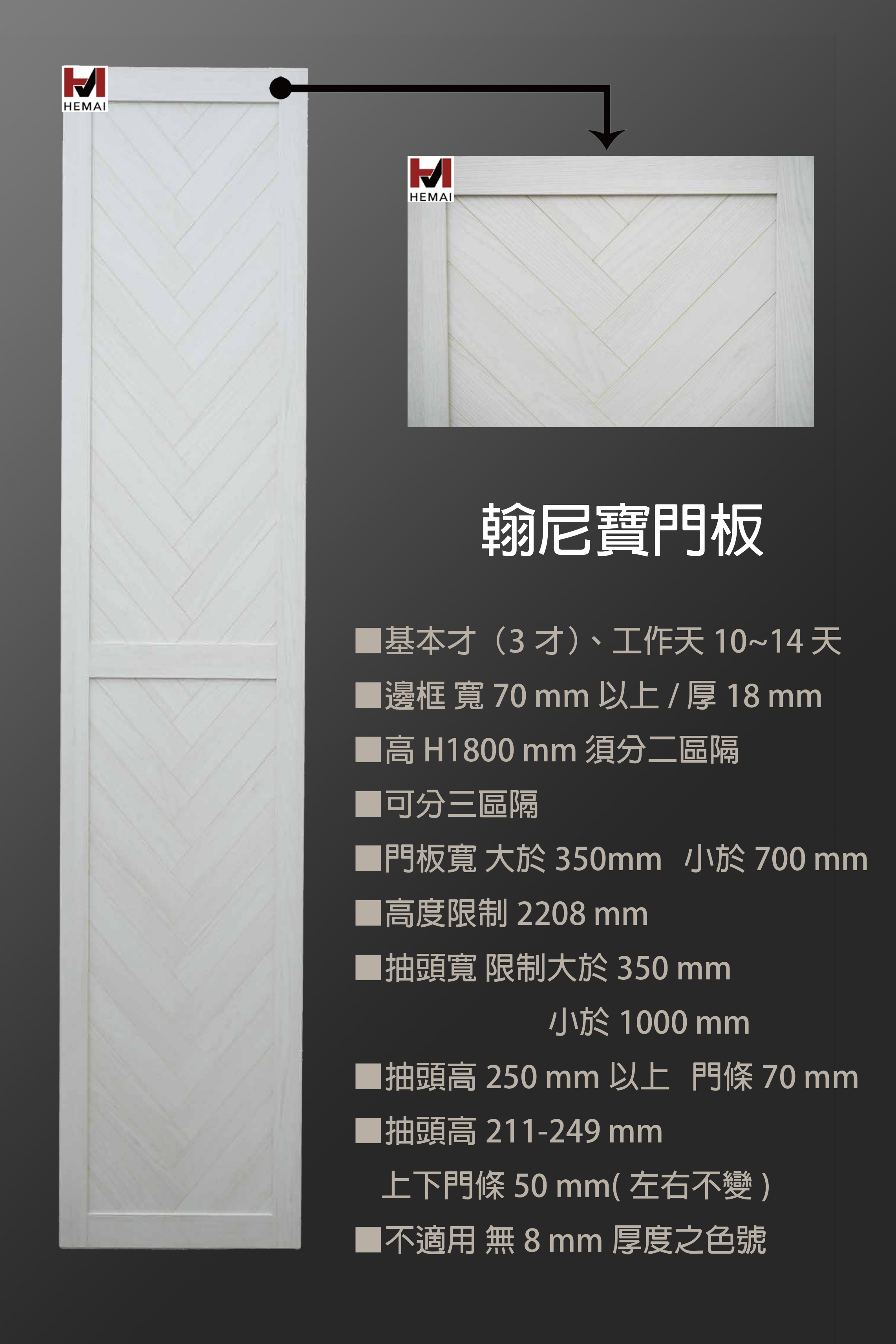 禾邁在造型樣式方面不斷力求創新,運用材料的特性不斷研發新的造型產品,在外型的變化與顏色搭配的巧思,創造千變萬化的全新樣式,造型門板皆以同色系統板加工製成,不僅無色差問題,並且在尺寸與外型的變化有相當大的彈性,在結構與耐久方面更經得起考驗。