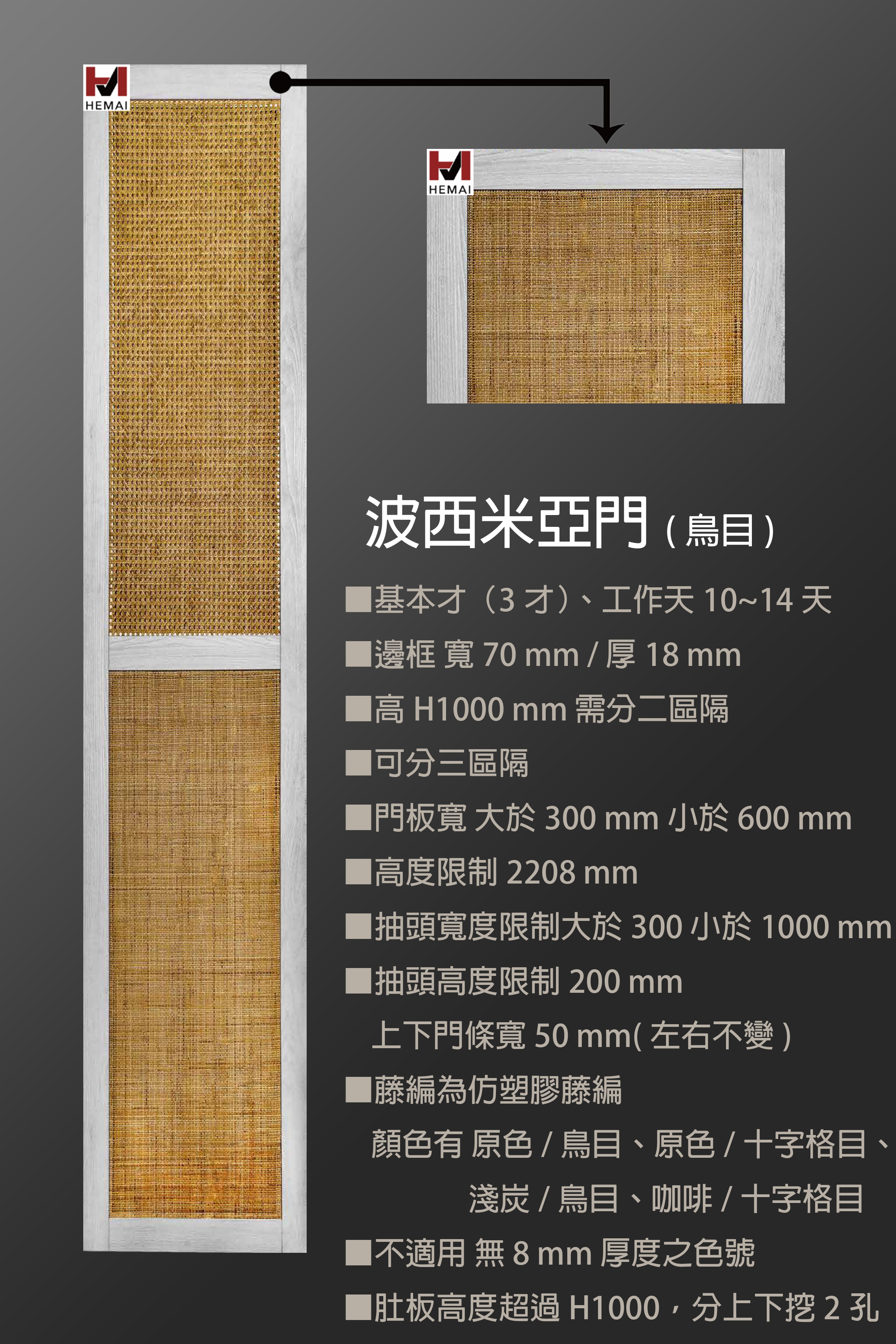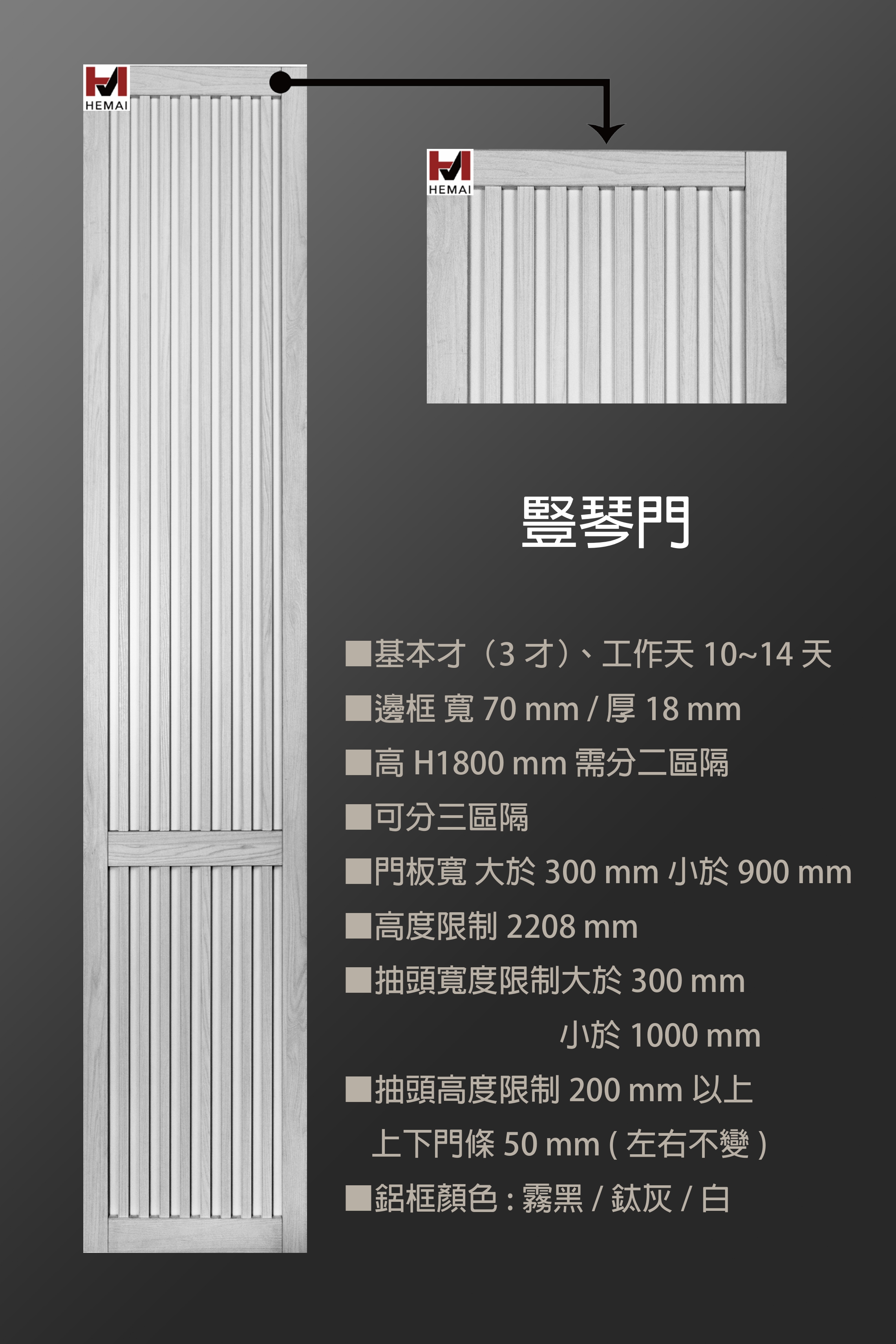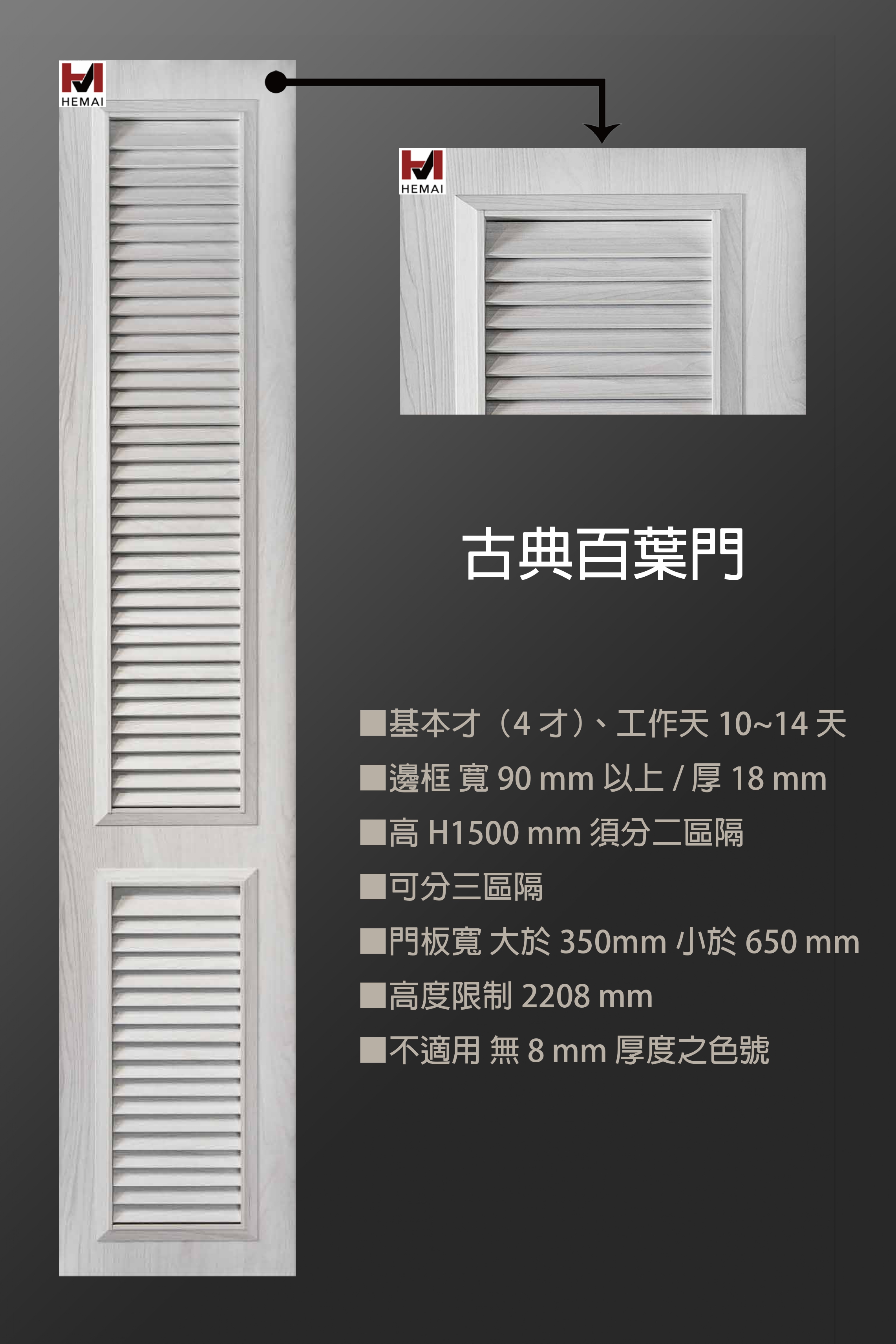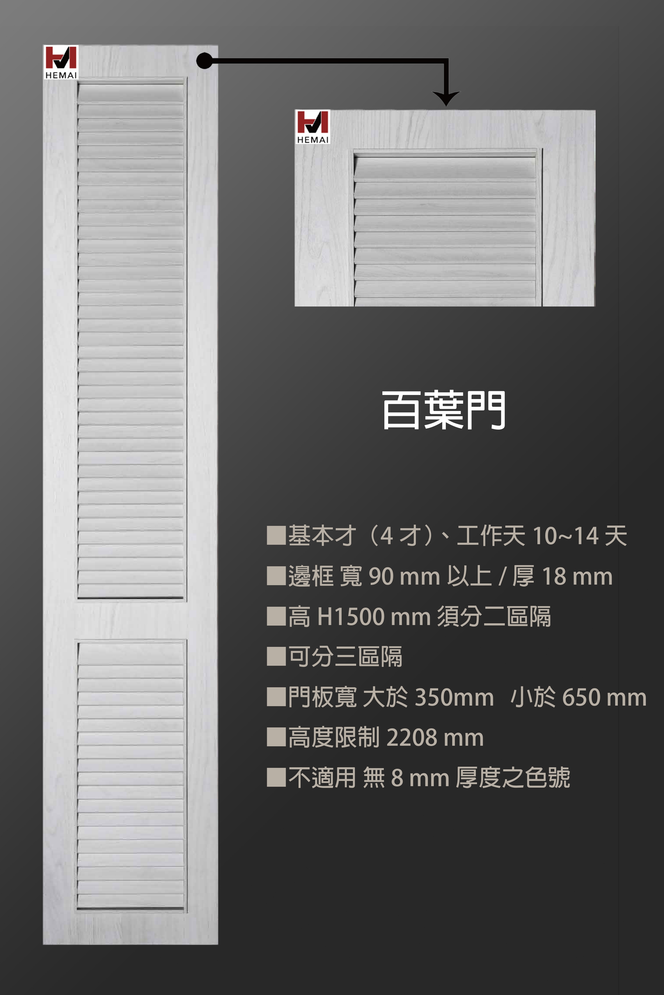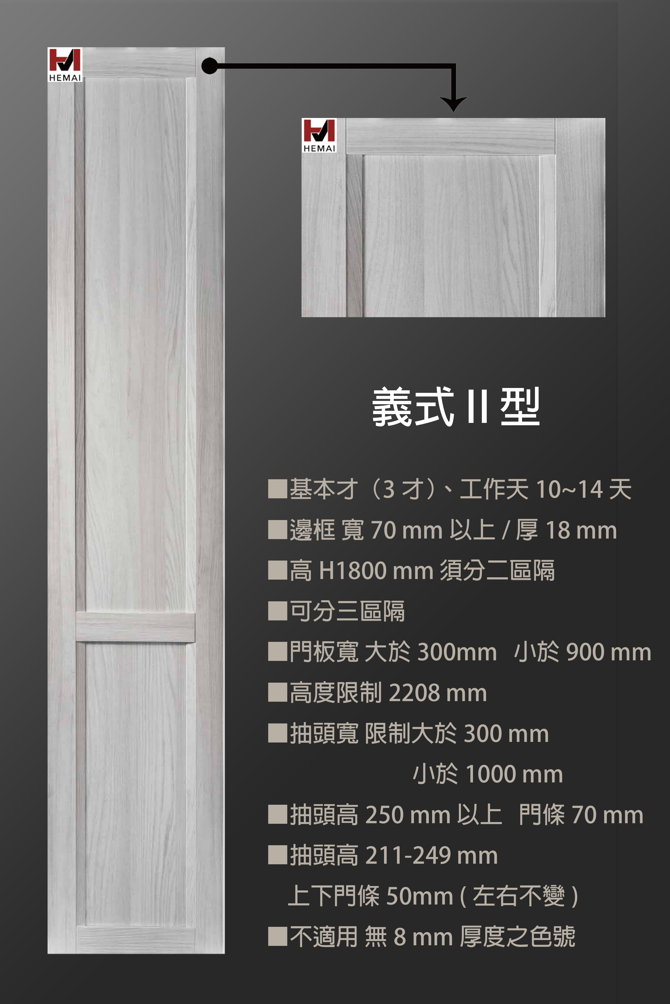 禾邁在造型樣式方面不斷力求創新,運用材料的特性不斷研發新的造型產品,在外型的變化與顏色搭配的巧思,創造千變萬化的全新樣式,造型門板皆以同色系統板加工製成,不僅無色差問題,並且在尺寸與外型的變化有相當大的彈性,在結構與耐久方面更經得起考驗。