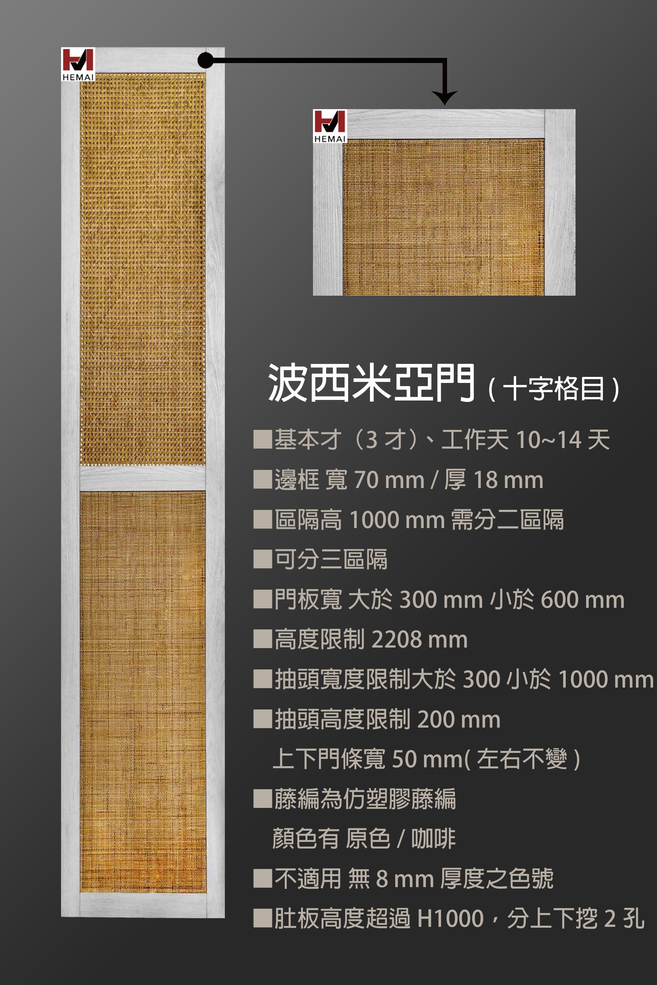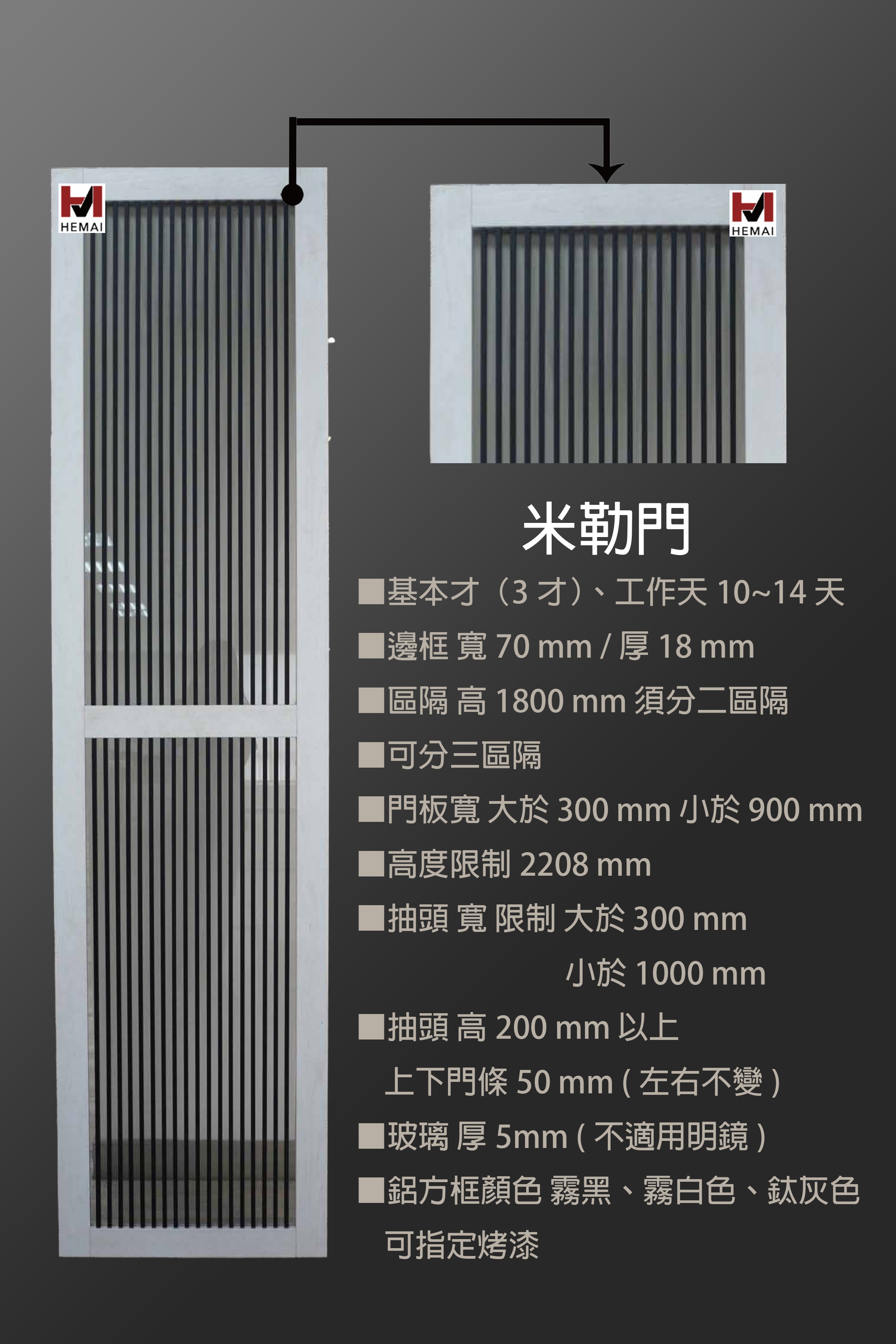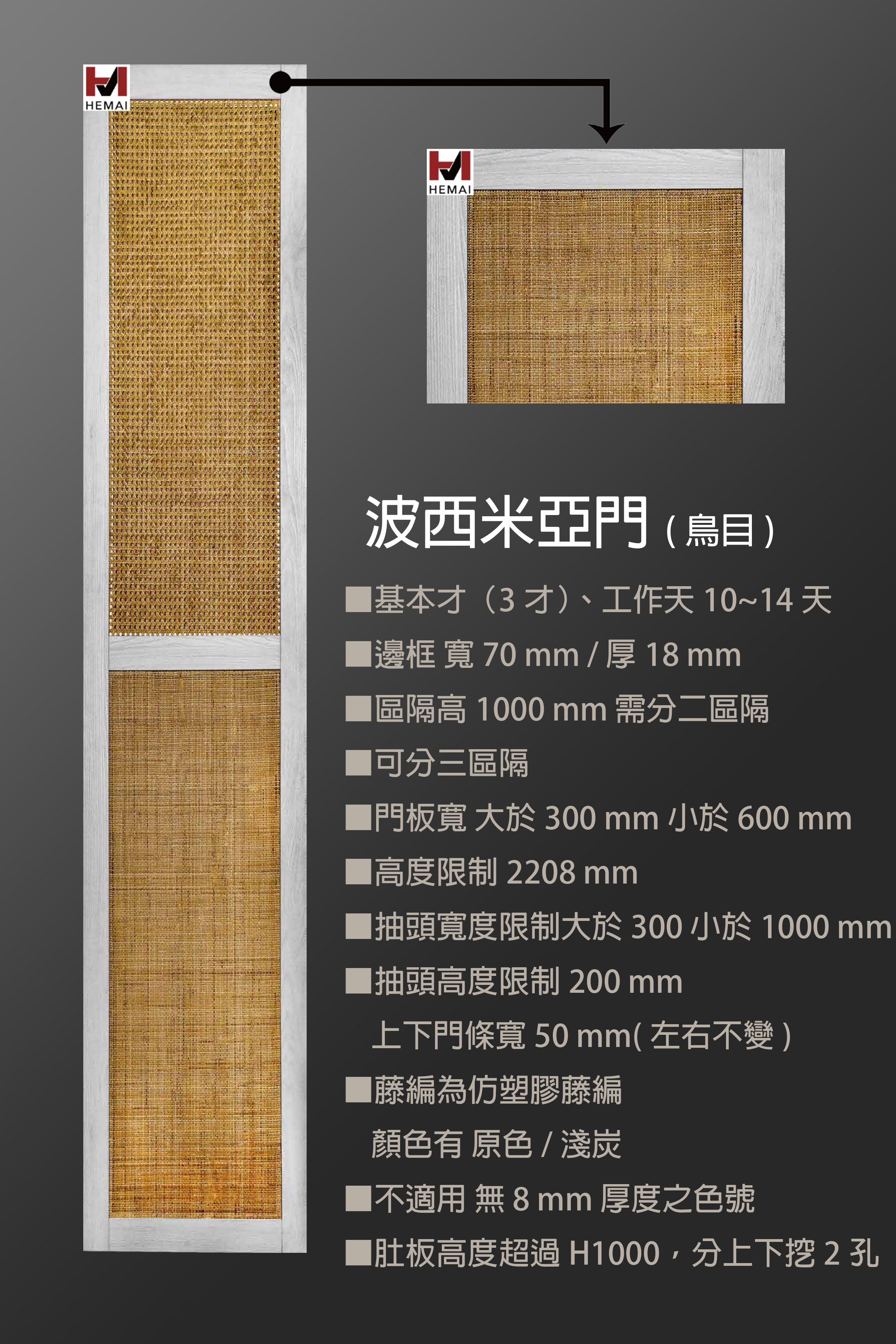 禾邁在造型樣式方面不斷力求創新,運用材料的特性不斷研發新的造型產品,在外型的變化與顏色搭配的巧思,創造千變萬化的全新樣式,造型門板皆以同色系統板加工製成,不僅無色差問題,並且在尺寸與外型的變化有相當大的彈性,在結構與耐久方面更經得起考驗。